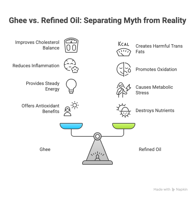 Reality: Ghee offers anti-inflammatory, antioxidant benefits and supports HDL, while refined oils promote oxidation, plaque buildup, and metabolic stress.
