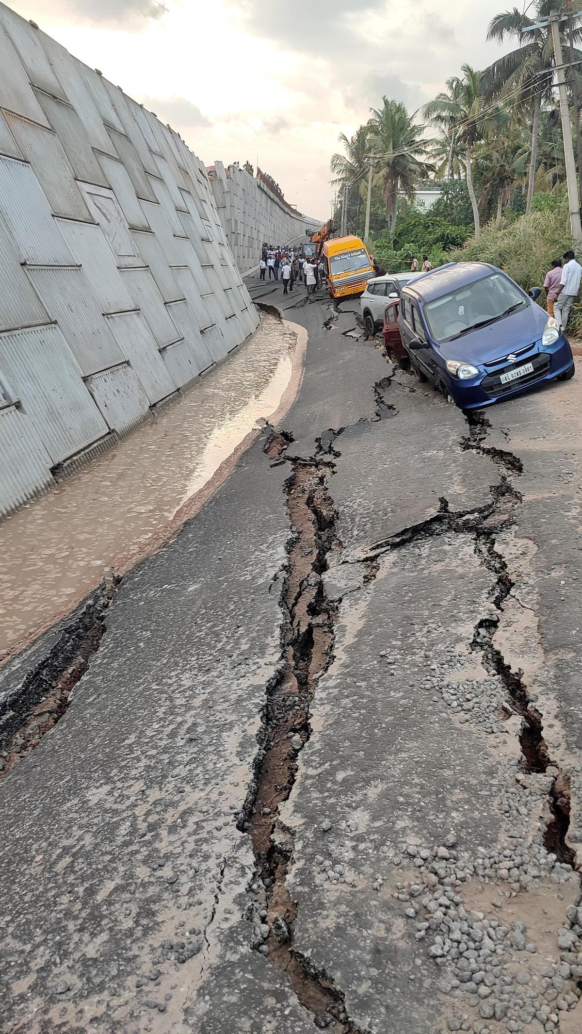 The sidewall of the approach road structure caved in catastrophically, leaving behind large craters on the service road below. This sudden collapse trapped four vehicles, including a school bus. Fortunately, all children and other passengers aboard were safely evacuated without sustaining any injuries. However, the incident caused traffic along the national highway towards Thiruvananthapuram to come to a standstill, prompting officials to implement diversions in the area.
